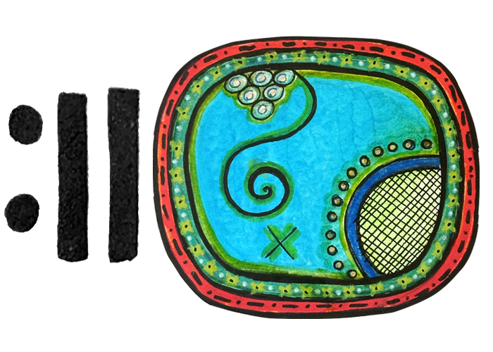 Kawoq Glyph: The group of spheres represents the members of a family and a group of families that belong to a community. The crosshatching means assistance or collaboration.