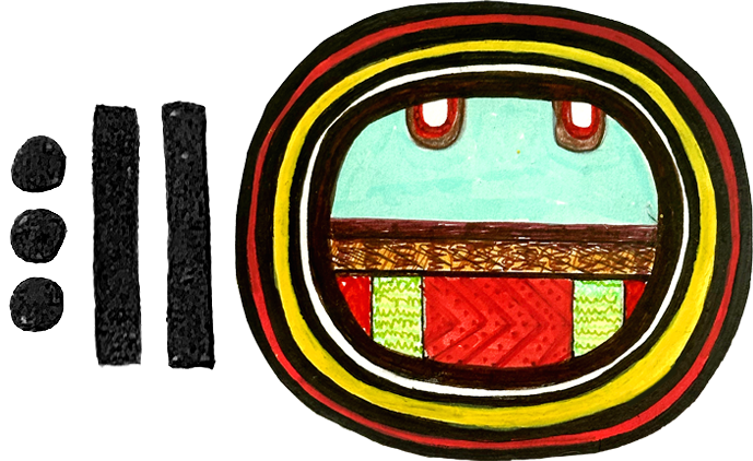Aj Glyph: The vertical lines or stalks at the top of the glyph that come only partway down signify spiritual growth. The horizontal line, symbolizing multiplication and the horizon, is an altar table, and the sacred trees, such as the ceiba and coral tree, with their roots, trunk, and canopy, also represent a table or altar. –Carlos Barrios