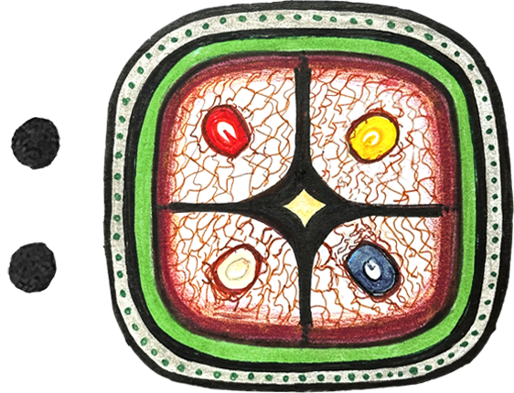 Q’anil Glyph: The glyph represents a perforation upon the earth with the Tixjob used to separate the earth to deposit the four seeds that represent the four colors of corn and the four races of humanity: red, black, white, yellow.