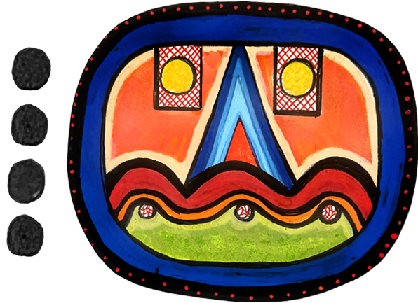 Aq’ab’al Glyph: The glyph signifies the owl and represents the light and dark at the same time. The two circumferences at the top represent the energy of creation, and the dots below represent receptive energy. –Carlos Barrios