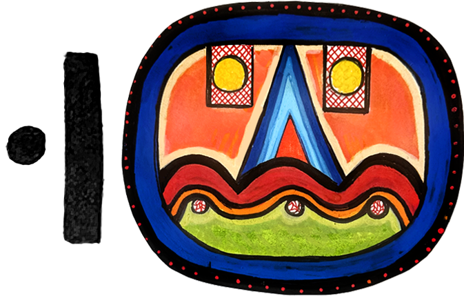 Aq’ab’al Glyph: The glyph signifies the owl and represents the light and dark at the same time. The two circumferences at the top represent the energy of creation, and the dots below represent receptive energy. –Carlos Barrios