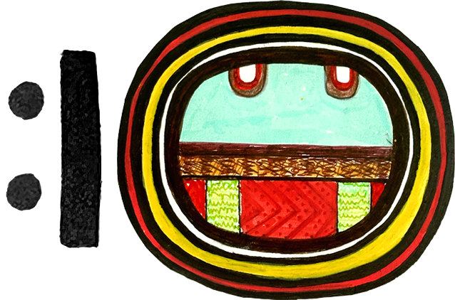 Aj Glyph: The vertical lines or stalks at the top of the glyph that come only partway down signify spiritual growth. The horizontal line, symbolizing multiplication and the horizon, is an altar table, and the sacred trees, such as the ceiba and coral tree, with their roots, trunk, and canopy, also represent a table or altar. –Carlos Barrios