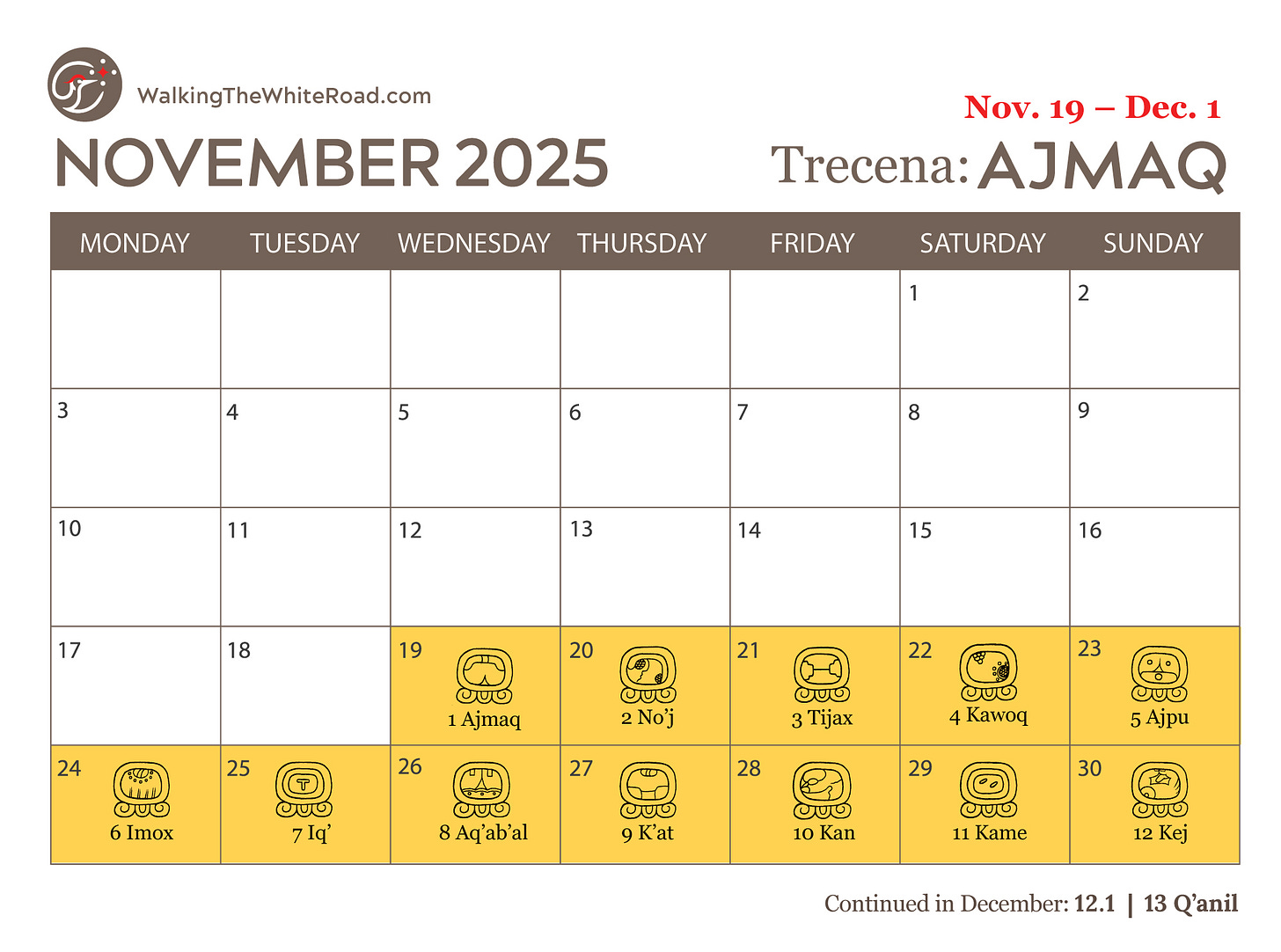 “Ajmaq is a favorable day to ask for and receive forgiveness, to manage harmony and discord, and to focus on the word, the message, the ancestral lines, and the energy that emanates from living bodies, called an aura. Ajmaq is the earth, the spirit of our Grandfathers. The energy of ‘Aj’ is the experience and virtue of a long walk through life. ‘Maq’ is like a curtain of smoke that hides us from the presence of Ajaw [God]. On this day, we can delve deeper into the purpose and direction of our lives.”