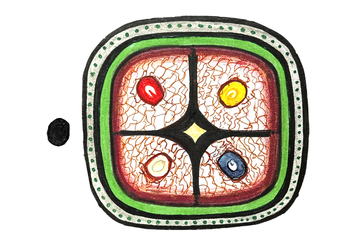 Q’anil Glyph: The glyph represents a perforation upon the earth with the Tixjob, that is used to separate the earth to deposit the seeds. The four seeds that represent the four colors of corn and the four races of humanity: red, black, white, yellow. –Denise Barrios
